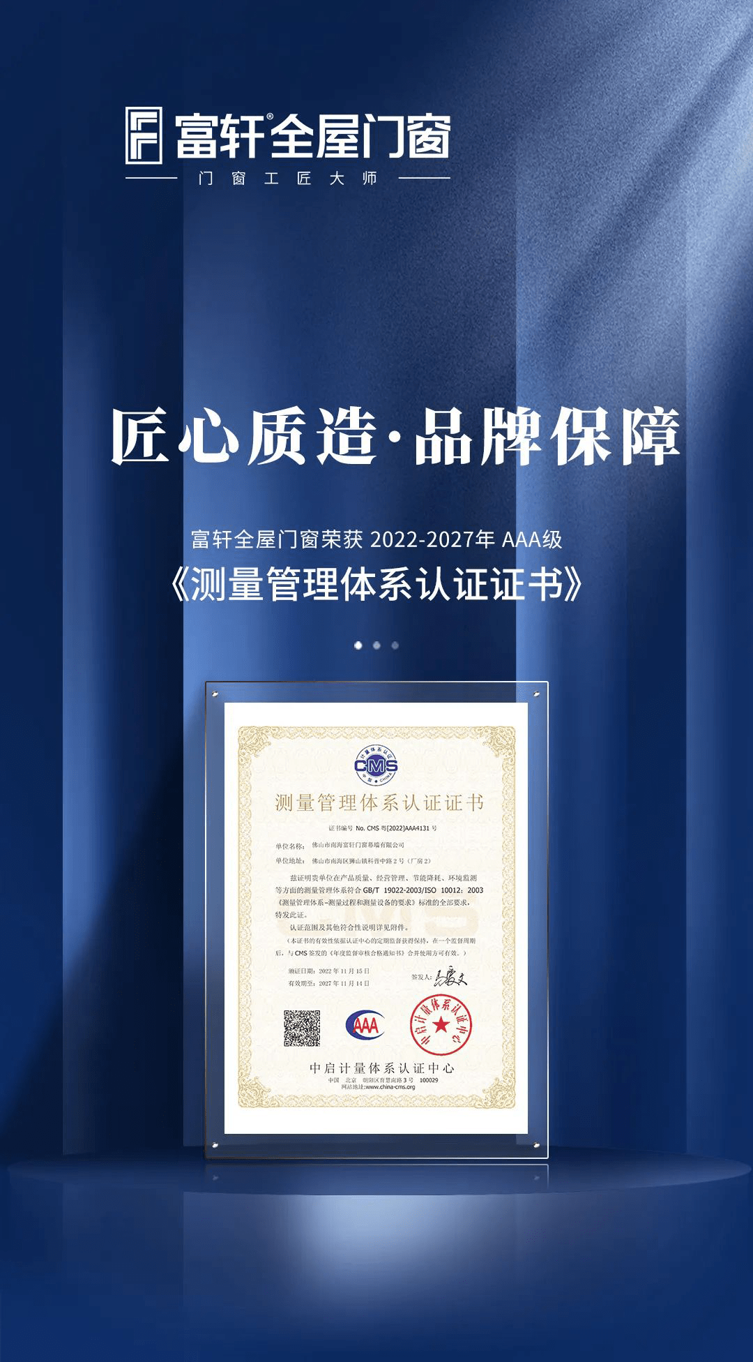 铸造品质管控的“标尺”| 富轩门窗荣 获 AAA级测量管理体系认证证书